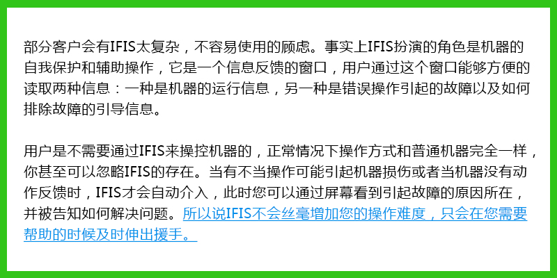 IFIS有什么功能? 有IFIS的機器幾乎可以不需要售后服務,因為根據(jù)我們幾十年的制造和服務經(jīng)驗編寫的故障判斷和分析幾乎覆蓋了正常使用中99%由于操作失誤引起的故障。系統(tǒng)能夠第一時間指導您排除問題,即刻恢復生產(chǎn)。新手甚至不需要詳讀說明書就可以上手機器,IFIS會提醒用戶如何規(guī)范的使用機器,老板不用再擔心操作工分心失誤而損壞機器,也不用重復開銷培訓新員工。