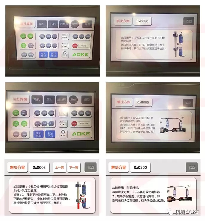 但是!我們奧克的系統(tǒng)可以一步到位的解決問題。例如,當系統(tǒng)監(jiān)測到液壓系統(tǒng)非正常過載時,主板會立即停止電機運轉(zhuǎn),并判斷引起非正常過載的原因,且提示故障碼。用戶點擊故障碼,系統(tǒng)會解析故障碼并給出解決方案,故障原因精準至每個輸入信號,解決方案指示步驟清晰,客戶僅需根據(jù)方案步驟調(diào)整機器,即刻就能恢復生產(chǎn),省時省力!